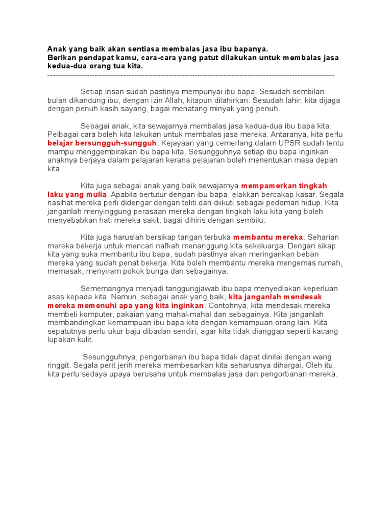 Karangan upsr cara cara membalas jasa ibu bapa soalan. 041113 Isi Penting Cara Membalas. Contoh karangan spm ibu bapa merupakan dua insan yang banyak berjasa bagi memastikan kejayaan anak anak dalam kehidupan.